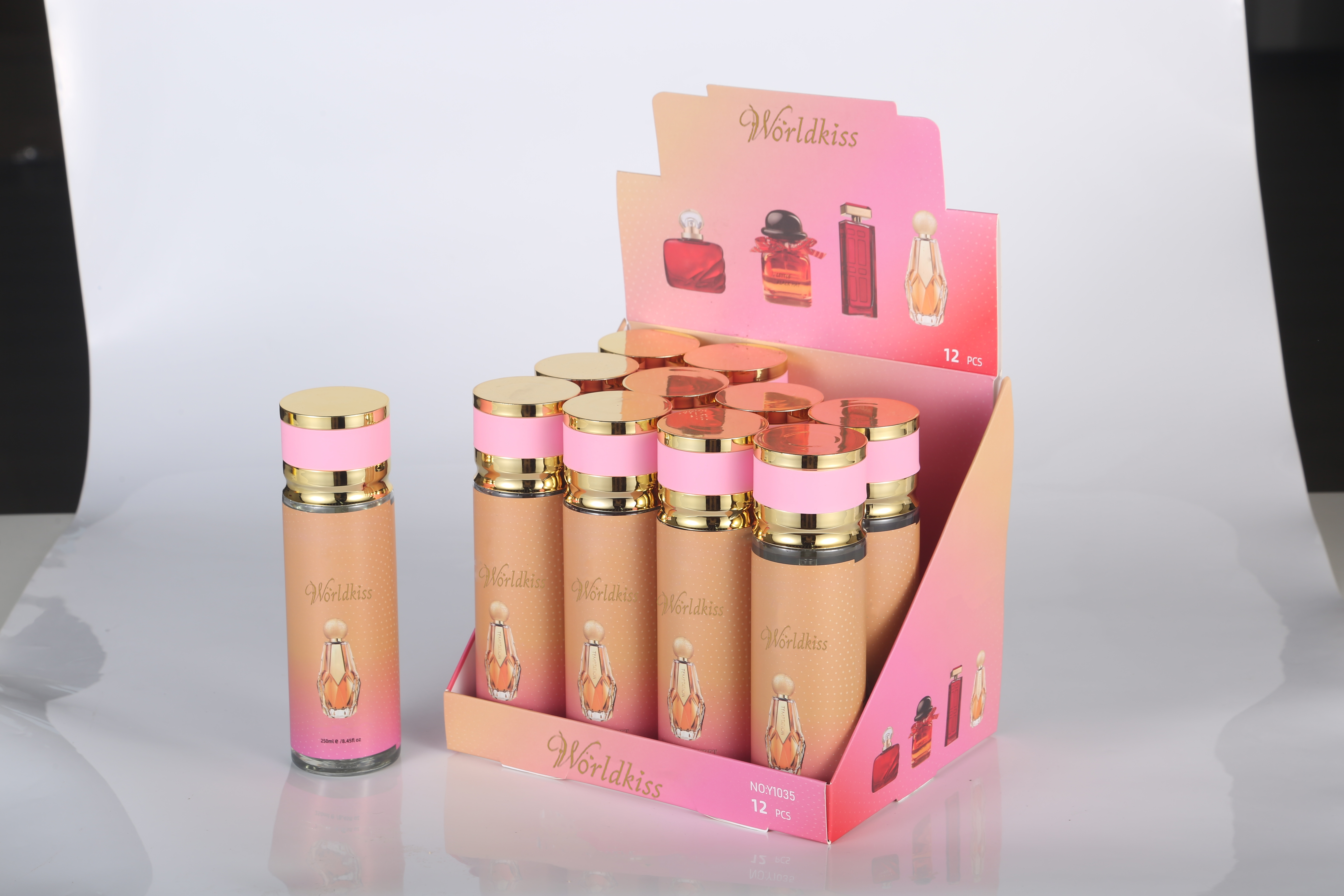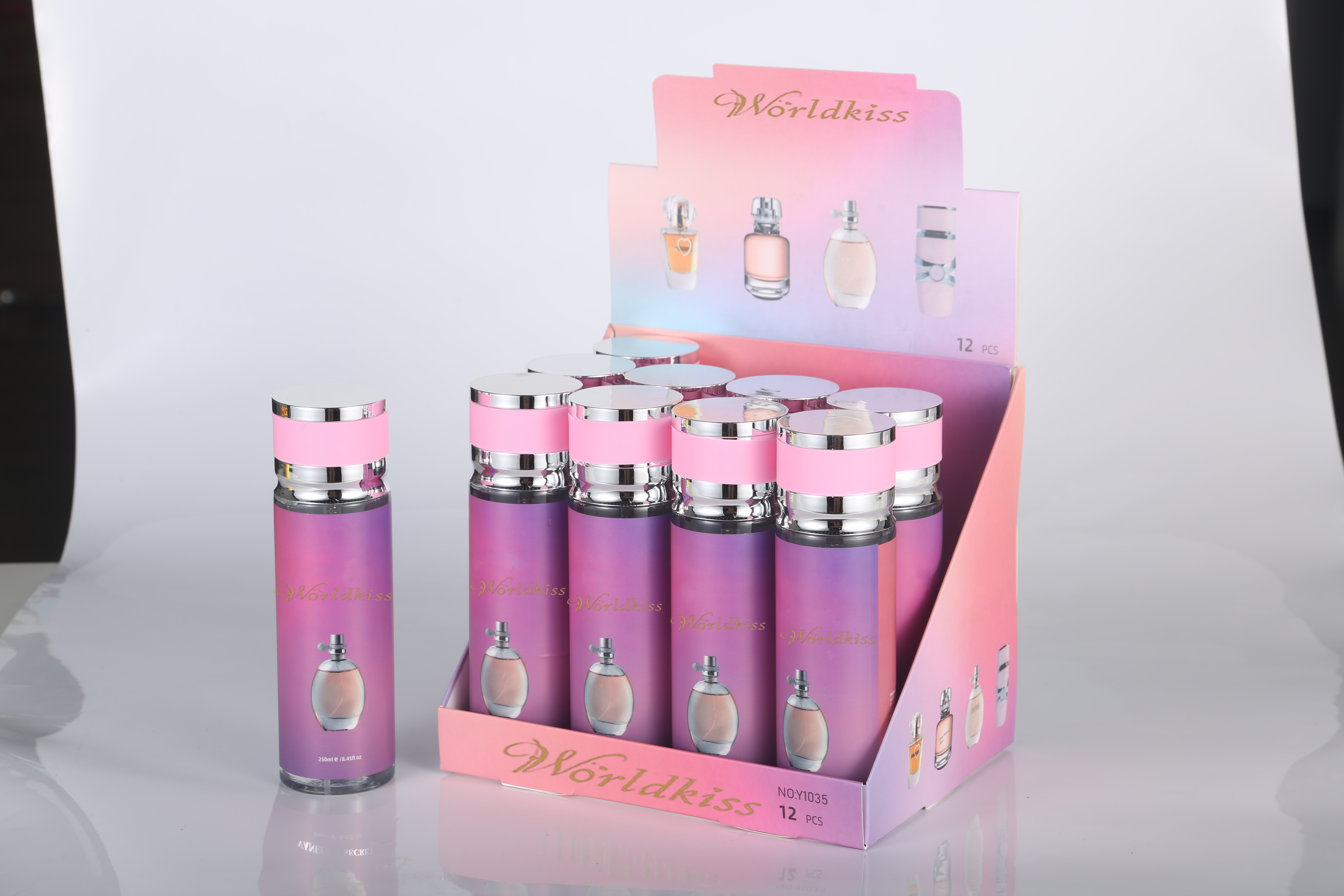 Disfrute de una refrescante explosión de elegancia con nuestro Perfume Mist de 250 ml. Ligero pero duradero, este spray de fina fragancia envuelve suavemente tu piel y cabello en un delicado aroma que dura todo el día. Perfecto para el uso diario, te deja una sensación de frescura, confianza e irresistible.